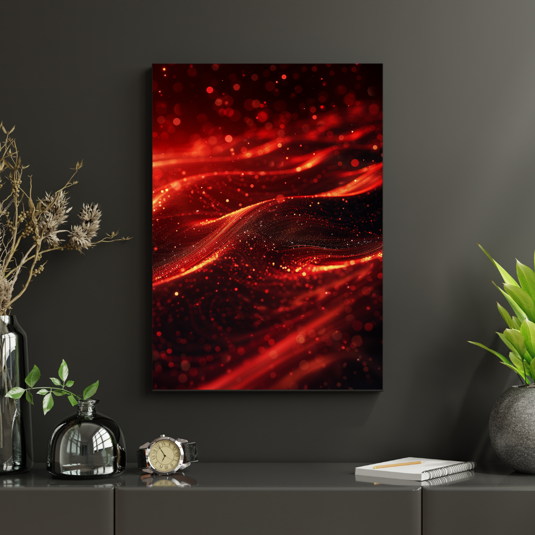 Cette affiche murale abstraite met en scène des vagues lumineuses rouges traversées de particules scintillantes. Le mouvement fluide et la profondeur visuelle créent une œuvre contemporaine à forte intensité émotionnelle.