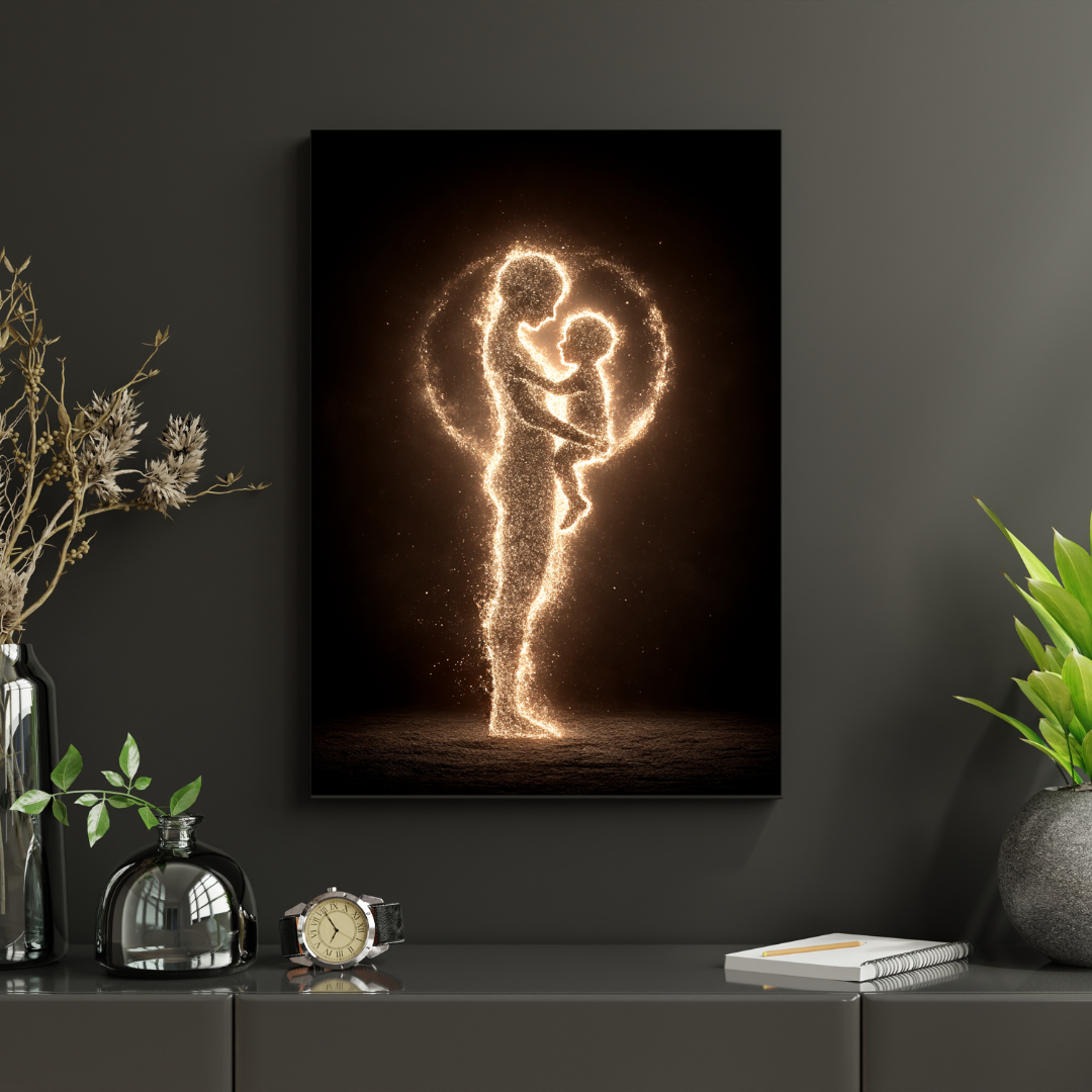 Cette affiche murale illustre un adulte portant un enfant dans ses bras, formés entièrement de particules lumineuses dorées. Les silhouettes se détachent sur un fond noir profond, créant une scène à la fois intime et symbolique.