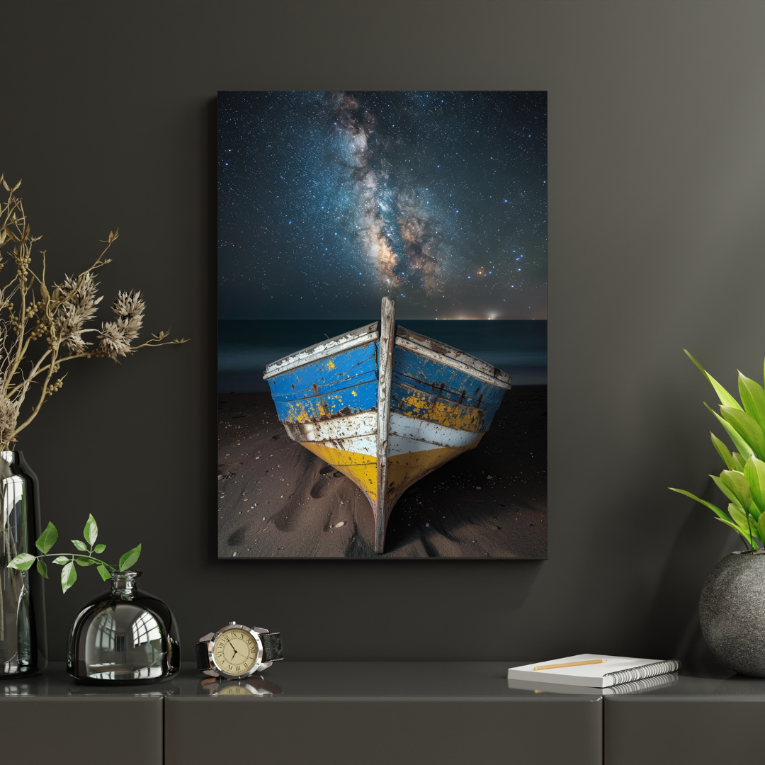 Cette affiche murale capture une barque solitaire posée sur le sable, faisant face à l’océan sous un ciel nocturne spectaculaire. La Voie lactée illumine la scène et crée une atmosphère à la fois paisible, mystérieuse et profondément inspirante.
