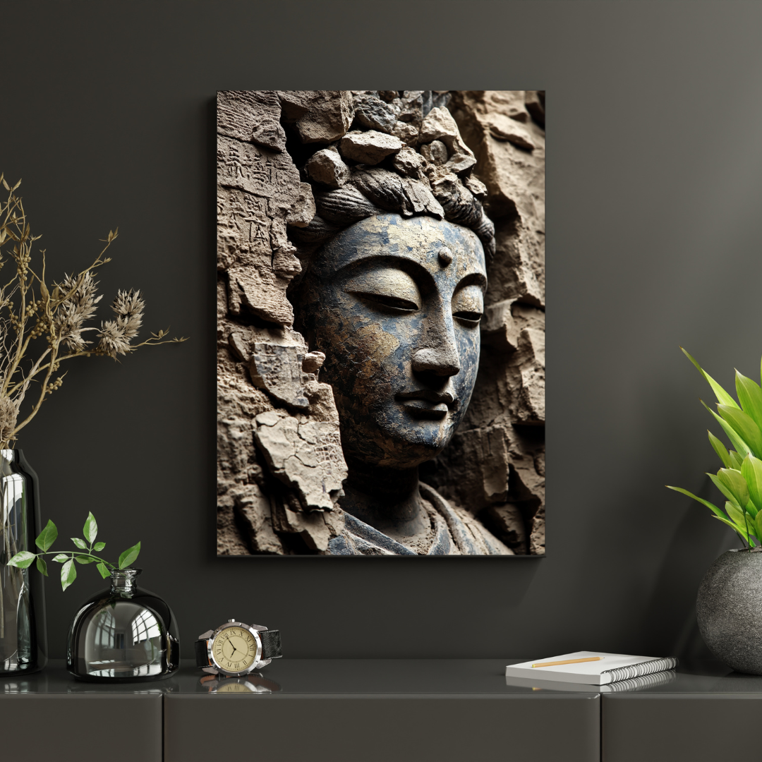 Le regard fermé du Bouddha, les traits doux et l’aspect minéral créent une scène propice à la contemplation. Les nuances de pierre et les reliefs irréguliers renforcent le caractère authentique et méditatif de cette affiche.
