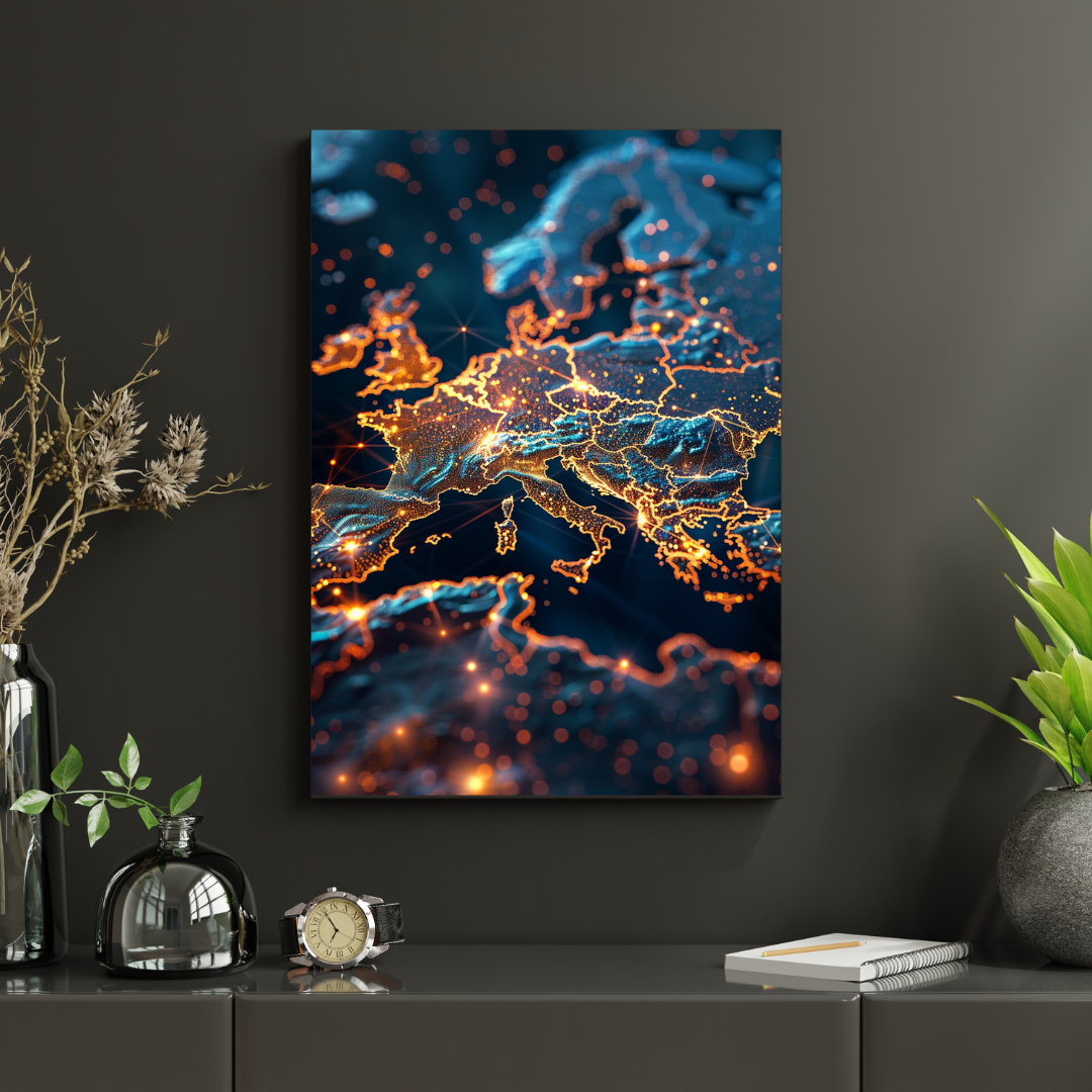 Cette affiche murale représente une carte de l’Europe stylisée, traversée de lignes et de points lumineux évoquant les connexions, les flux et l’énergie contemporaine. Une œuvre visuelle puissante qui allie géographie et esthétique futuriste.