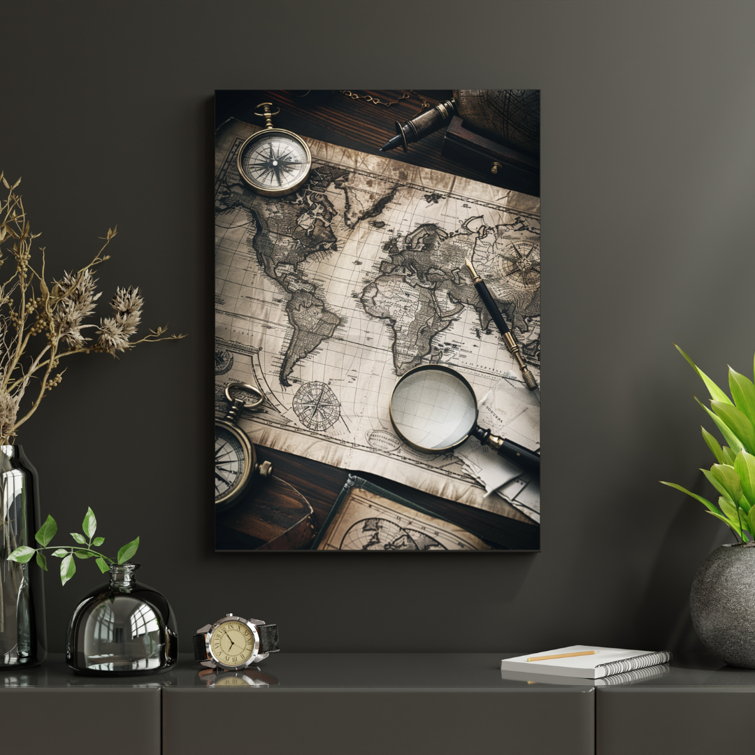Cette affiche murale met en scène une carte du monde au style vintage, accompagnée d’objets d’exploration emblématiques comme une boussole, une loupe et des instruments anciens. Elle évoque l’esprit d’aventure, de découverte et de curiosité qui a marqué les grandes explorations.