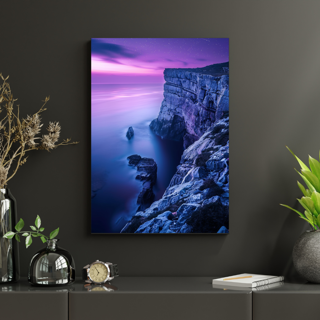 Cette affiche murale capture une falaise rocheuse dominant une mer calme, baignée par les nuances violettes et bleutées du crépuscule. Le ciel étoilé et la lumière douce de l’horizon créent une atmosphère à la fois mystérieuse et apaisante.
