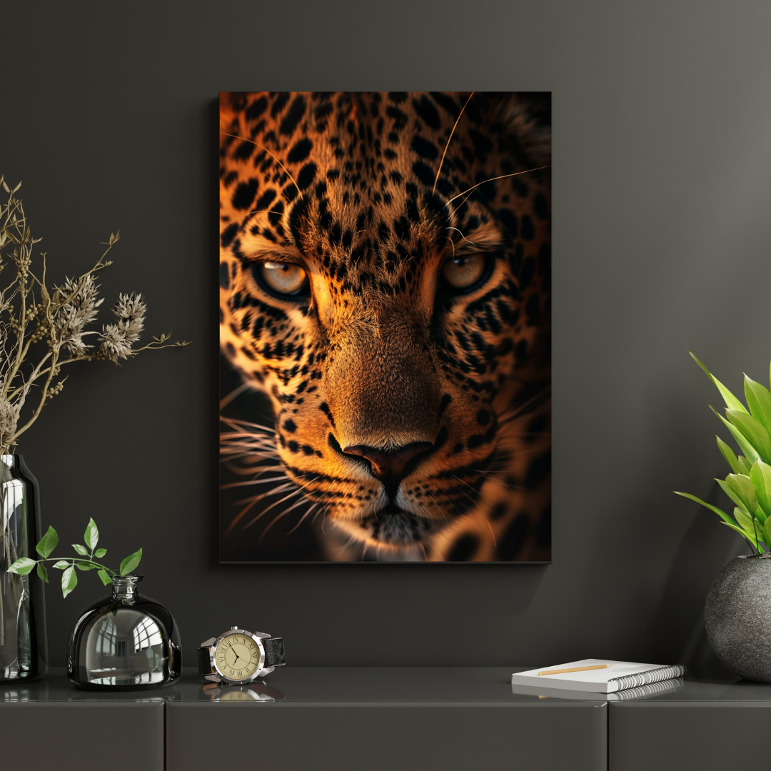 Cette affiche murale met en scène un léopard en gros plan, dont le regard perçant capte immédiatement l’attention. Chaque détail de son pelage et de son expression révèle la force tranquille et la majesté de cet animal emblématique.