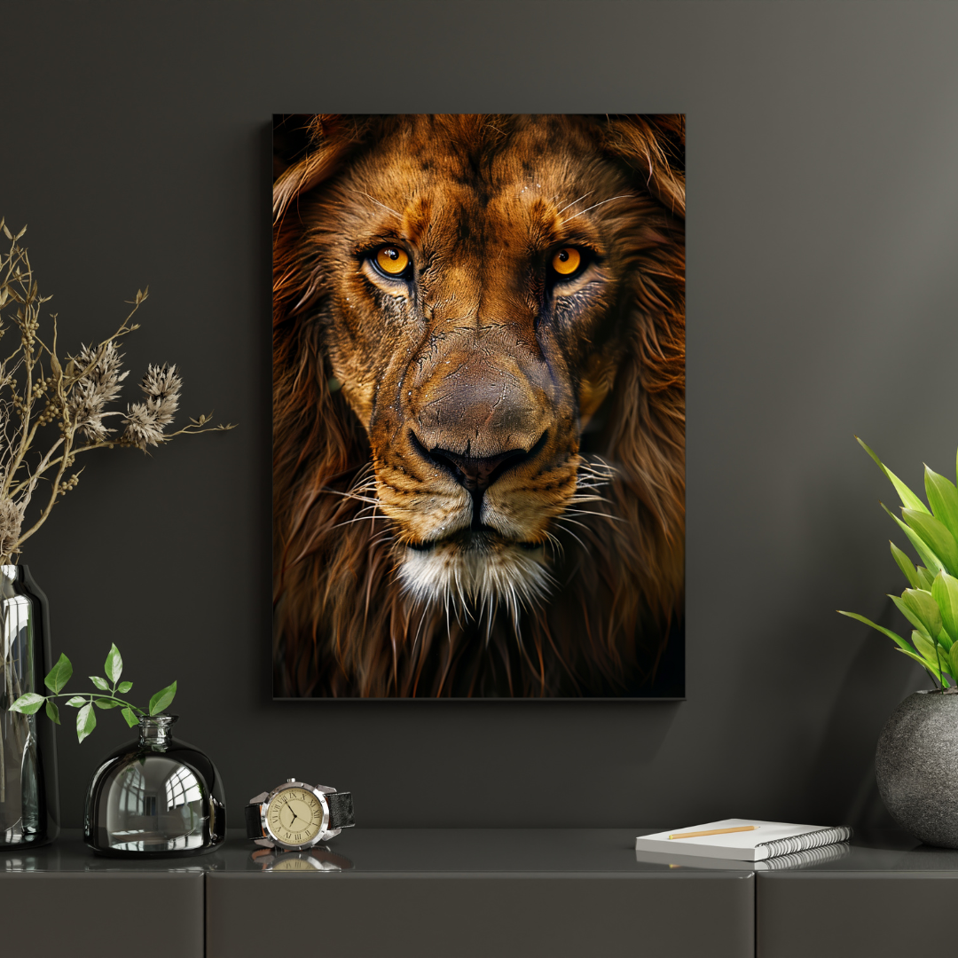 Cette affiche murale met en scène un lion en gros plan, symbole intemporel de force, de courage et de sagesse. Son regard profond et assuré impose le respect et dégage une présence calme et majestueuse.