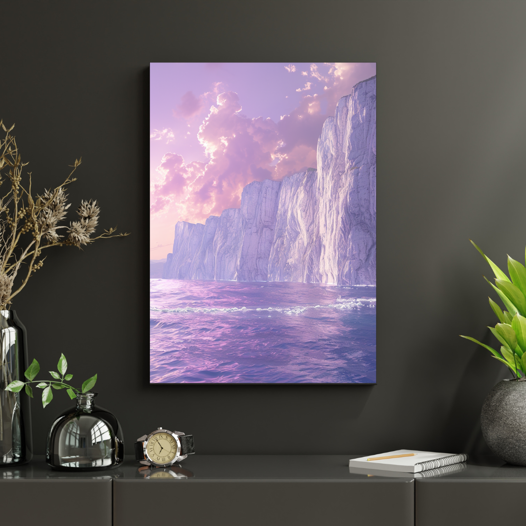 Cette affiche murale dévoile un paysage côtier spectaculaire où d’imposantes falaises claires rencontrent une mer paisible, baignées par une lumière pastel aux nuances rosées et violettes. L’atmosphère est à la fois grandiose et profondément apaisante.