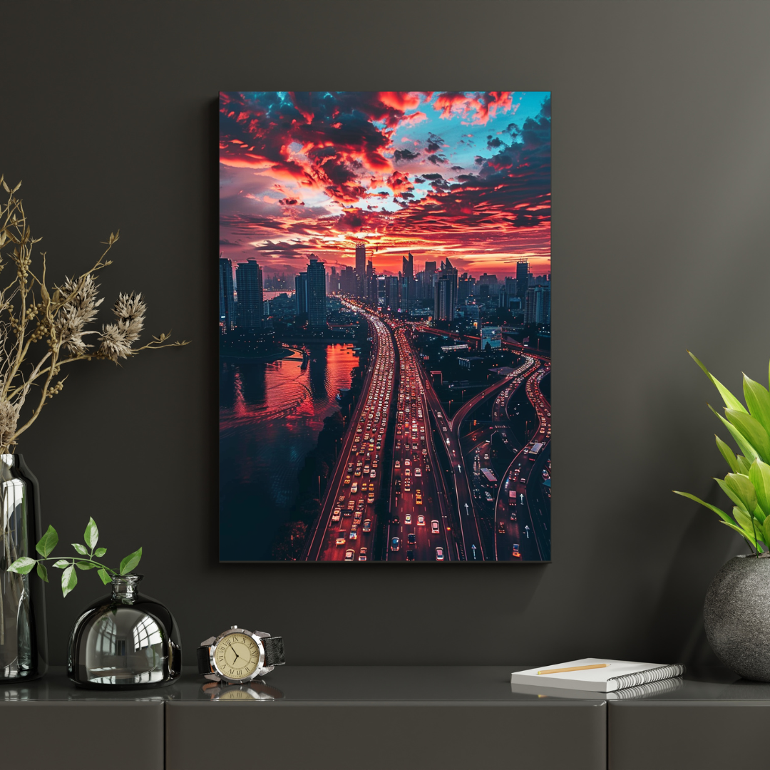 Cette affiche murale capture l’énergie brute d’une métropole moderne au moment où le ciel s’embrase de couleurs incandescentes. Les nuages rougeoyants surplombent un flot continu de lumières urbaines, révélant la puissance, le mouvement et la vie incessante de la ville.