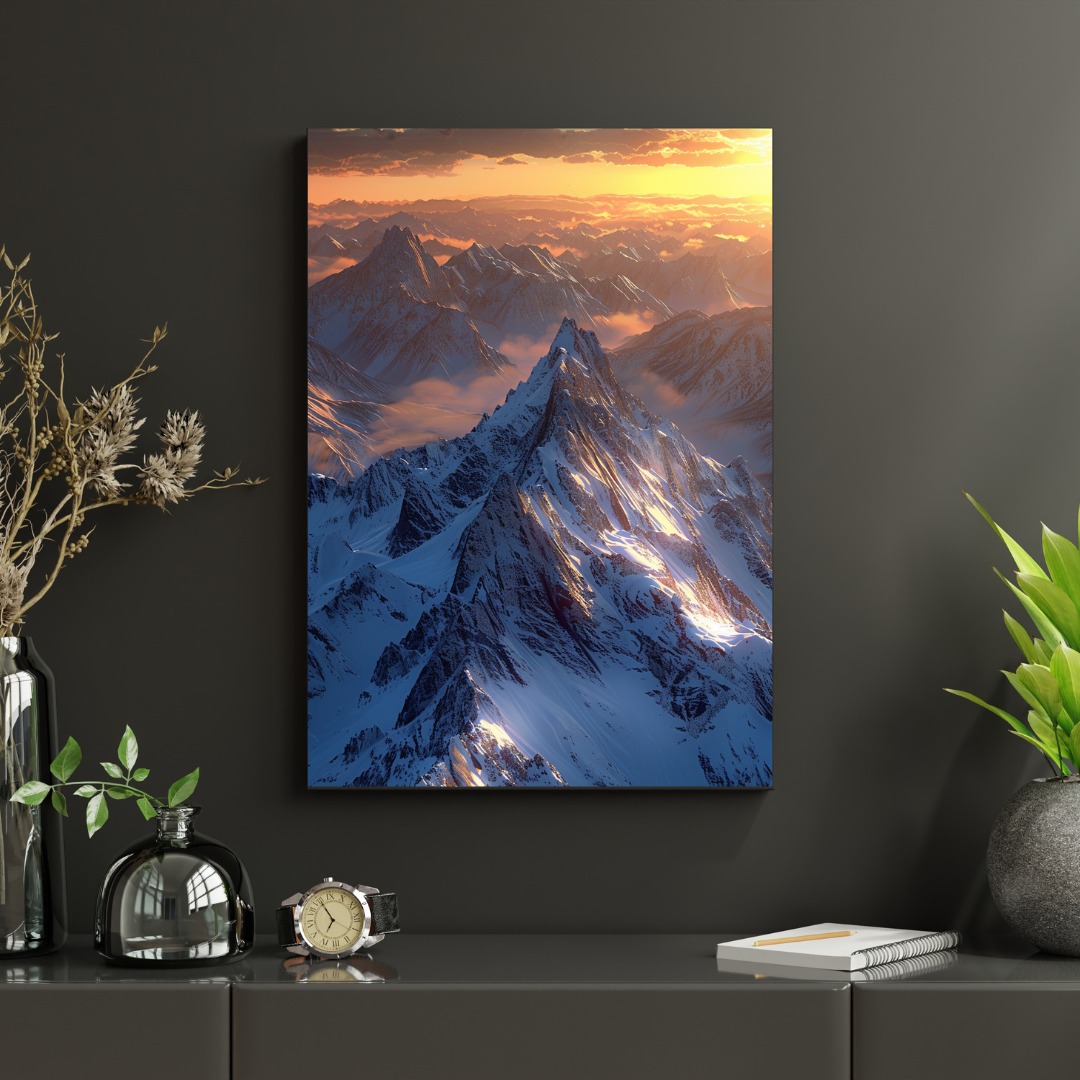 Cette affiche murale dévoile une chaîne de sommets enneigés s’étendant à perte de vue, sublimée par une lumière chaude de lever de soleil. Le contraste entre la neige froide et les reflets dorés crée une atmosphère spectaculaire, à la fois puissante et apaisante.