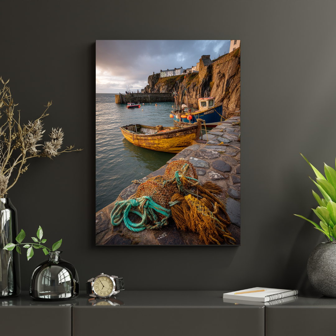 Cette affiche murale capture l’atmosphère paisible et vivante d’un petit port de pêche niché au pied de falaises rocheuses. Entre bateaux colorés amarrés, filets de pêche au premier plan et maisons blanches dominant la côte, la scène évoque la douceur de la vie maritime.