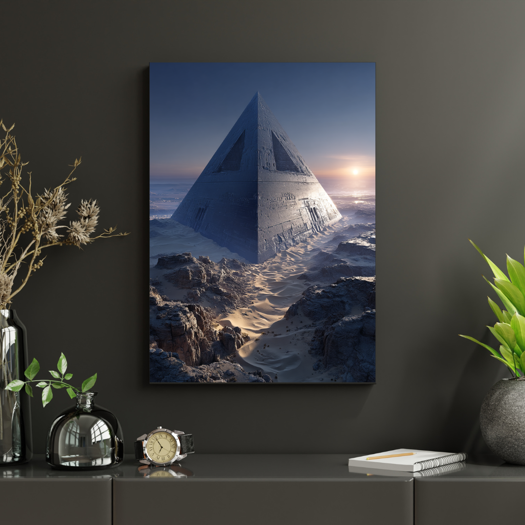 Cette affiche murale représente une immense pyramide aux lignes nettes, posée au cœur d’un paysage désertique rocheux. La scène baigne dans une lumière douce de fin de journée, entre ciel bleu profond et lueur dorée à l’horizon, créant une atmosphère à la fois énigmatique et immersive.