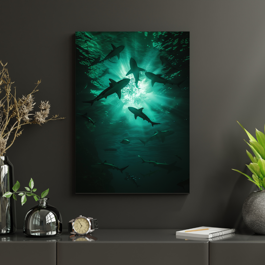 Cette affiche murale plonge le regard au cœur de l’océan, où plusieurs requins glissent dans une lumière vert émeraude filtrant depuis la surface. L’atmosphère est mystérieuse, immersive et intensément captivante, évoquant la force brute et la beauté sauvage du monde marin.