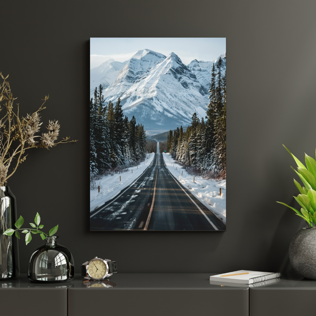 Cette affiche murale représente une route solitaire traversant une forêt enneigée, guidant le regard vers des montagnes imposantes aux sommets recouverts de neige. La composition évoque l’évasion, la liberté et le calme des grands espaces.