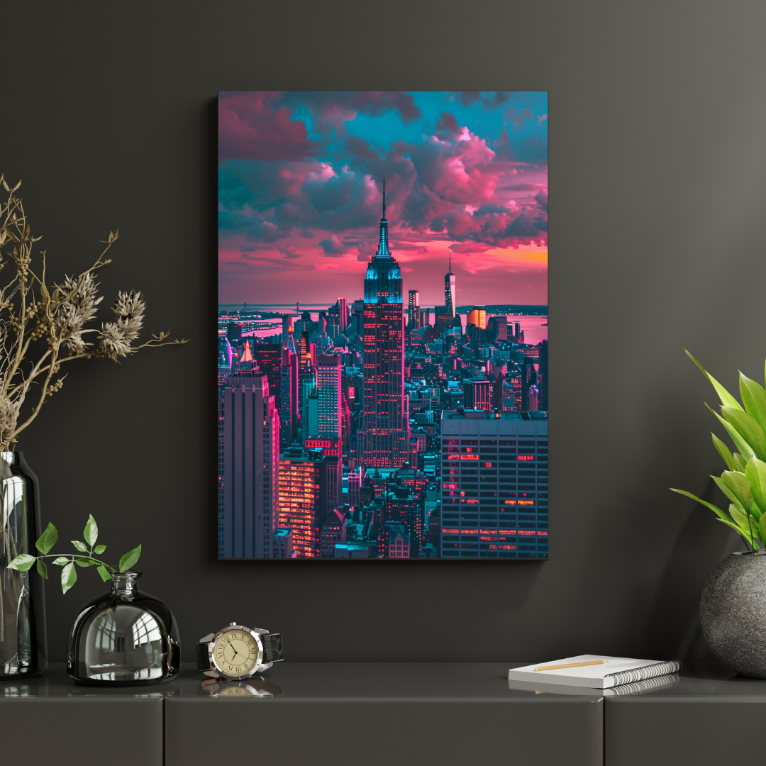 La composition verticale met en valeur un gratte-ciel central dominant la ville, entouré d’un paysage urbain dense et lumineux. Le contraste entre les bâtiments éclairés et le ciel coloré crée une image puissante, presque cinématographique.