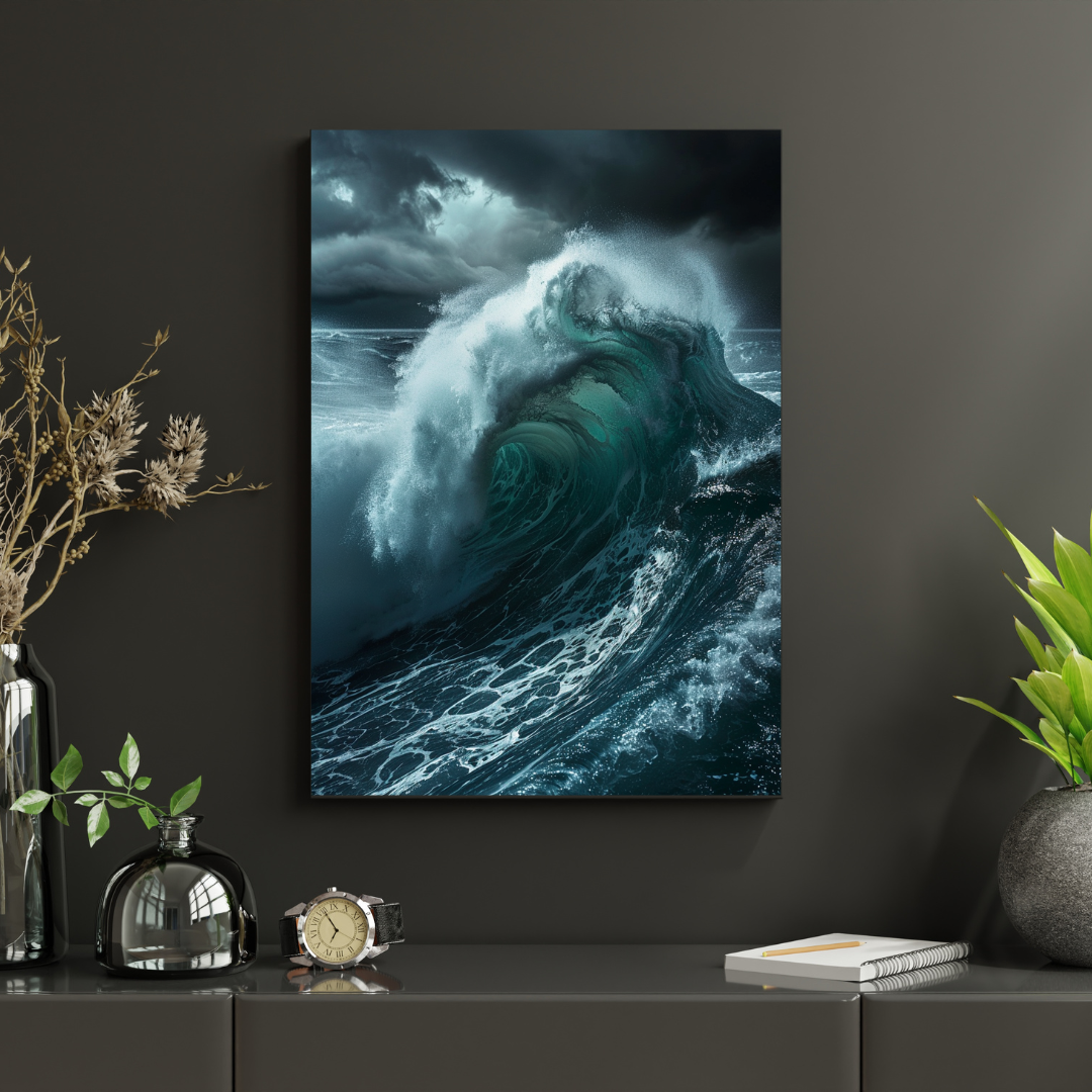 Cette affiche murale impressionnante met en scène une vague monumentale surgissant sous un ciel sombre et orageux. L’eau tourbillonnante, teintée de nuances profondes de bleu et de vert, incarne la puissance brute et indomptable de la mer.