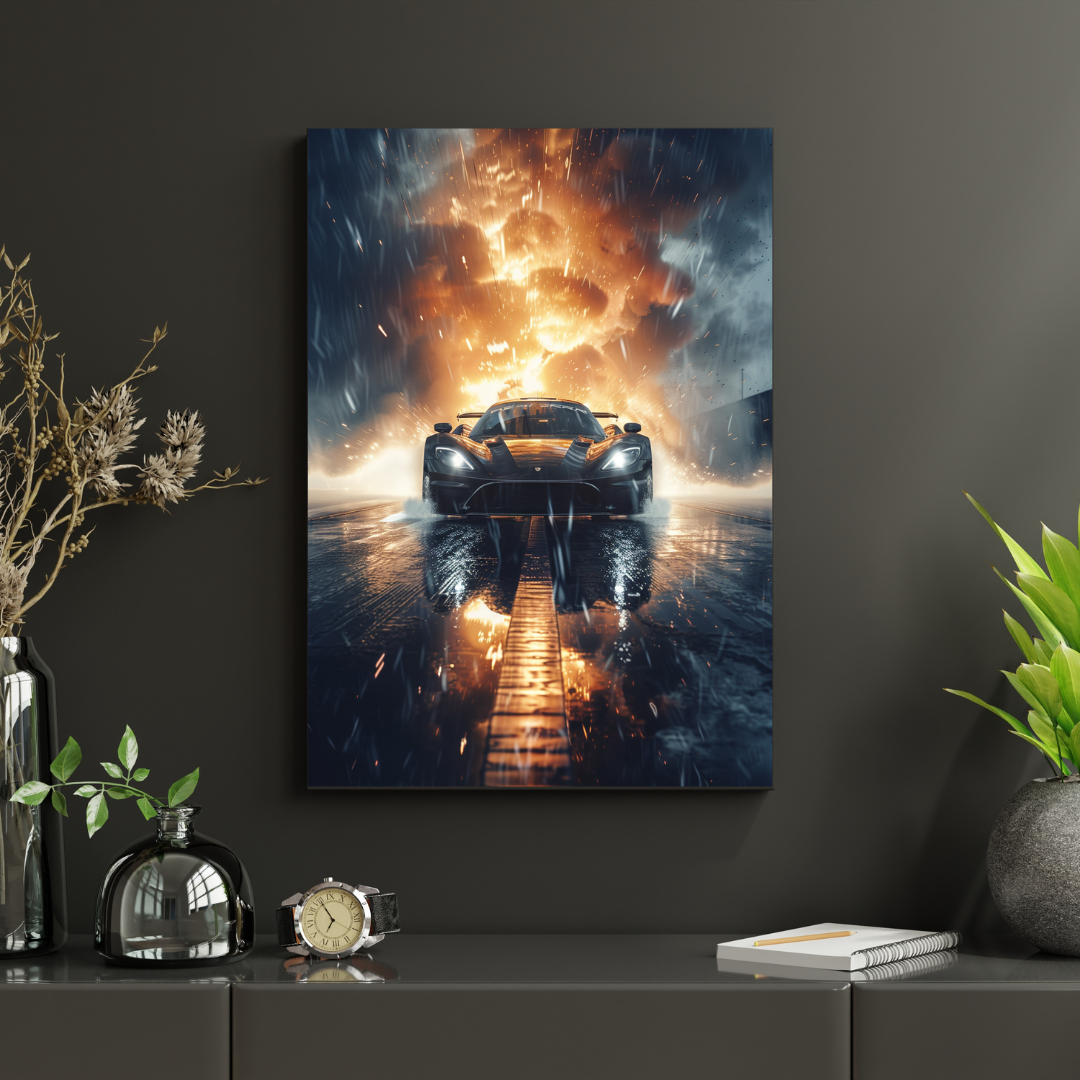 La voiture incarne la performance et le contrôle, tandis que l’explosion symbolise l’énergie brute et le dépassement des limites. Cette affiche murale évoque la vitesse, le danger et la détermination.