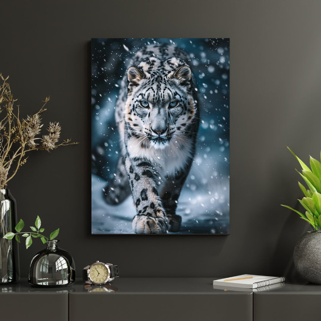 Cette affiche murale met en scène une panthère des neiges avançant dans un décor hivernal, sous une fine chute de neige. Une image puissante et captivante qui évoque la force, la liberté et le mystère de la nature sauvage.