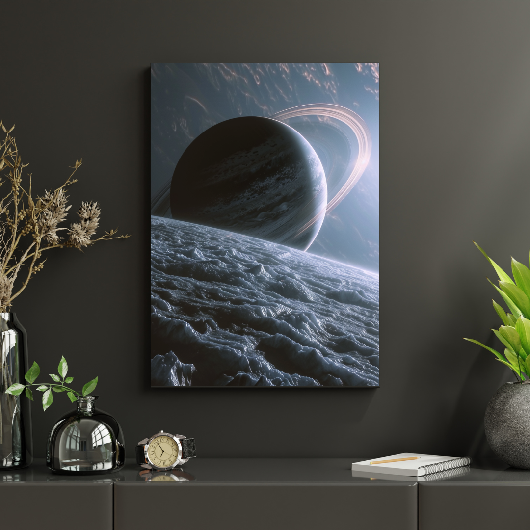 La composition met en contraste une surface glacée aux reliefs marqués et une planète géante suspendue dans le vide spatial. Les tons froids et la lumière douce créent une ambiance futuriste et contemplative.