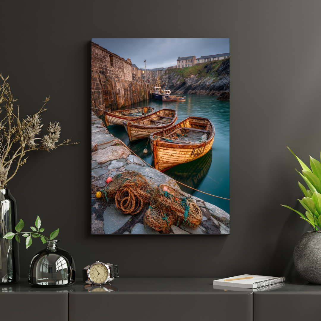 Les textures du bois usé des bateaux, les filets de pêche posés sur le quai et la pierre ancienne des murs apportent une grande richesse visuelle. La composition plonge instantanément dans l’atmosphère d’un port côtier chargé d’histoire.