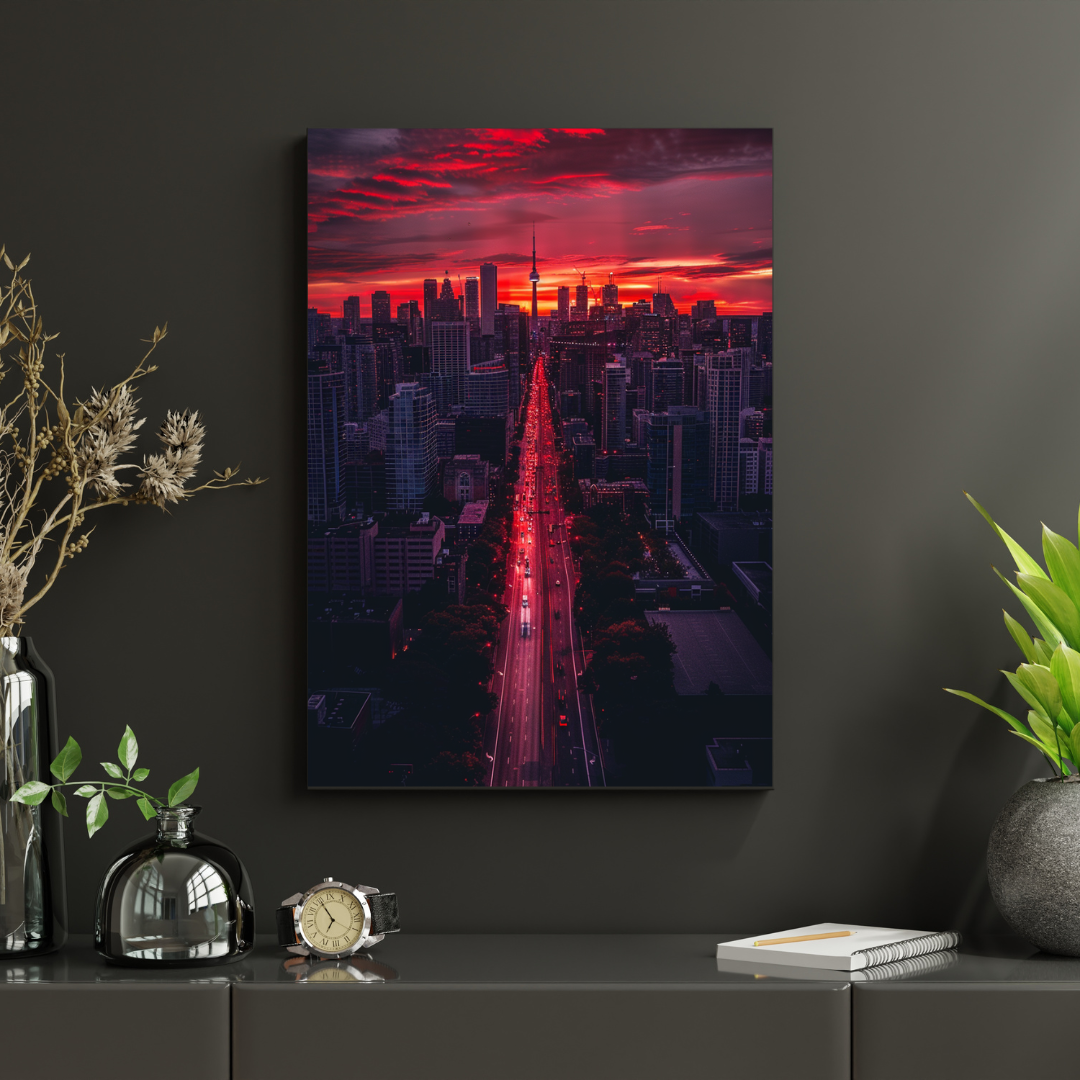 Cette affiche murale capture une grande ville vue en plongée, traversée par une avenue centrale illuminée sous un ciel rouge intense. L’atmosphère dramatique du coucher de soleil sublime les lignes architecturales et l’énergie urbaine.