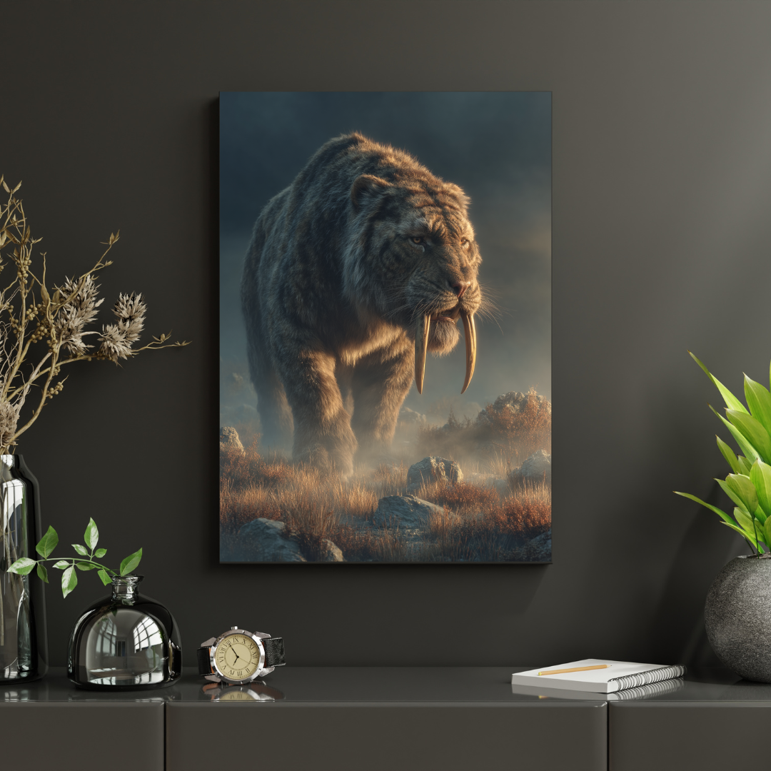 Cette affiche murale représente un tigre à dents de sabre avançant dans un paysage sauvage et brumeux. Son regard intense, sa musculature massive et ses longues canines imposantes incarnent toute la force et la majesté de ce félin préhistorique.