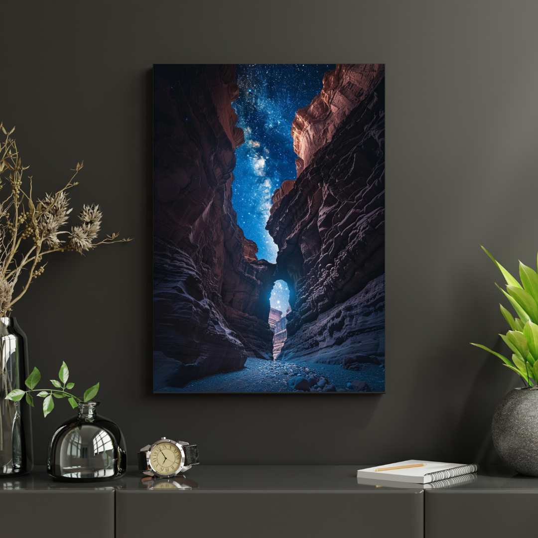 Cette affiche murale plonge le regard dans un canyon majestueux, observé depuis le sol, où les parois rocheuses s’élèvent vers un ciel nocturne parsemé d’étoiles. L’ouverture naturelle du canyon agit comme un passage visuel entre la terre et l’infini.