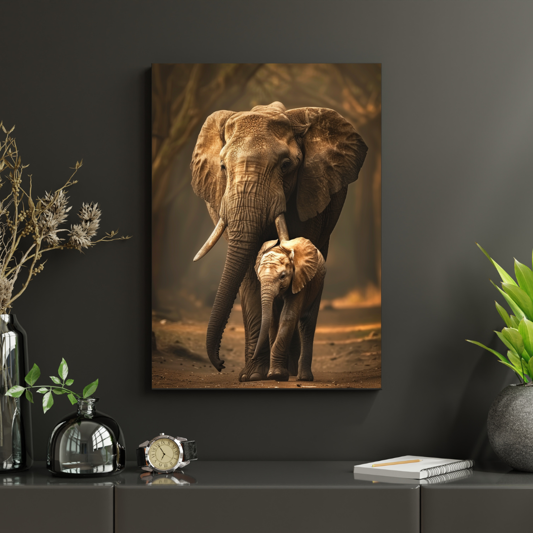 Cette affiche murale met en scène un éléphant adulte marchant aux côtés de son éléphanteau. L’image capture un instant de calme et de protection, dans une ambiance chaleureuse et naturelle, au cœur d’un décor boisé.